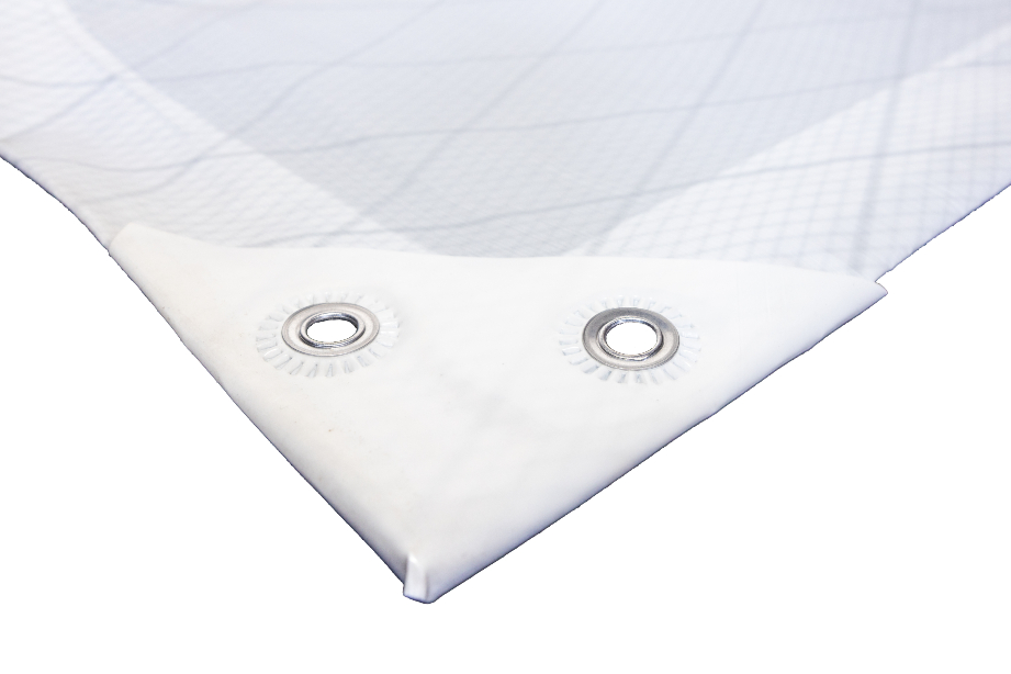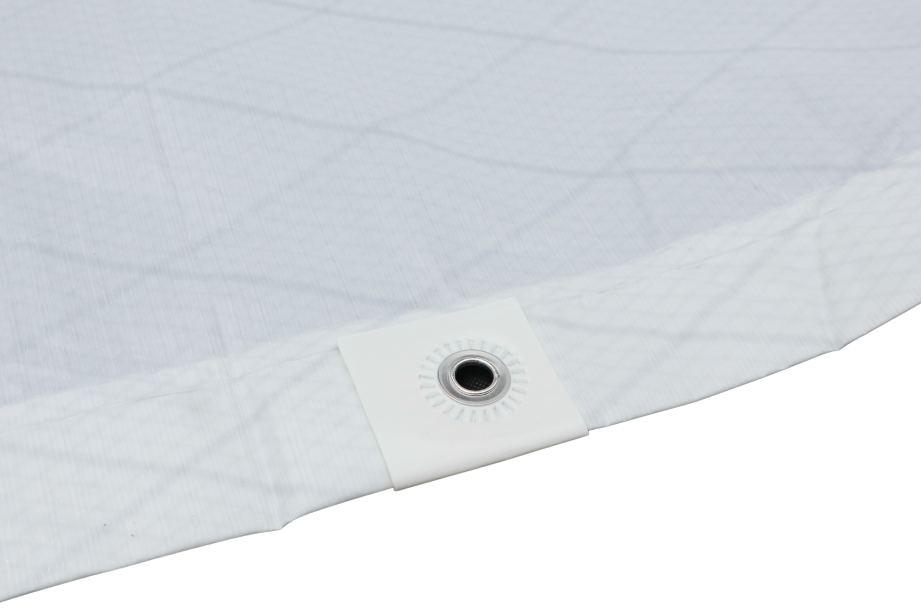 - Bevestiging: Ultrasoon gelaste ogen die één geheel vormen met het zeil. Deze ogen zijn aanzienlijk sterker en minder gevoelig voor uitscheuren dan gestanste metalen ringen.
