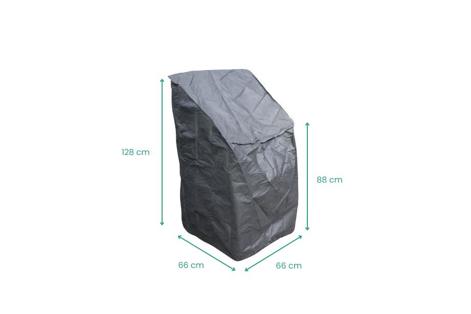 Deze hoes is ontworpen voor de meest gangbare stapelbare tuinstoelen. Hij past wanneer de breedte en diepte van de onderste stoel maximaal 66 cm zijn en de totale stapelhoogte niet hoger is dan 128 cm. In de praktijk betekent dit dat bijna alle kunststof, aluminium, wicker en metalen stapelstoelen onder deze hoes passen.