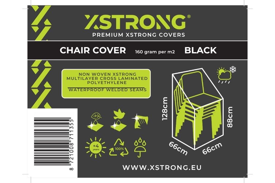 De Xstrong Premium Covers hoes tuinstoelen (66×66×88×128 cm) beschermt 4–6 gestapelde stoelen tegen regen, UV-straling en vuil. De luxe stofachtige uitstraling blijft waterdicht en kleurvast dankzij het UV bestendige laminaat en de volledig gelaste naden. Ideaal voor winteropslag, seizoensgebruik en dagelijks buitengebruik.